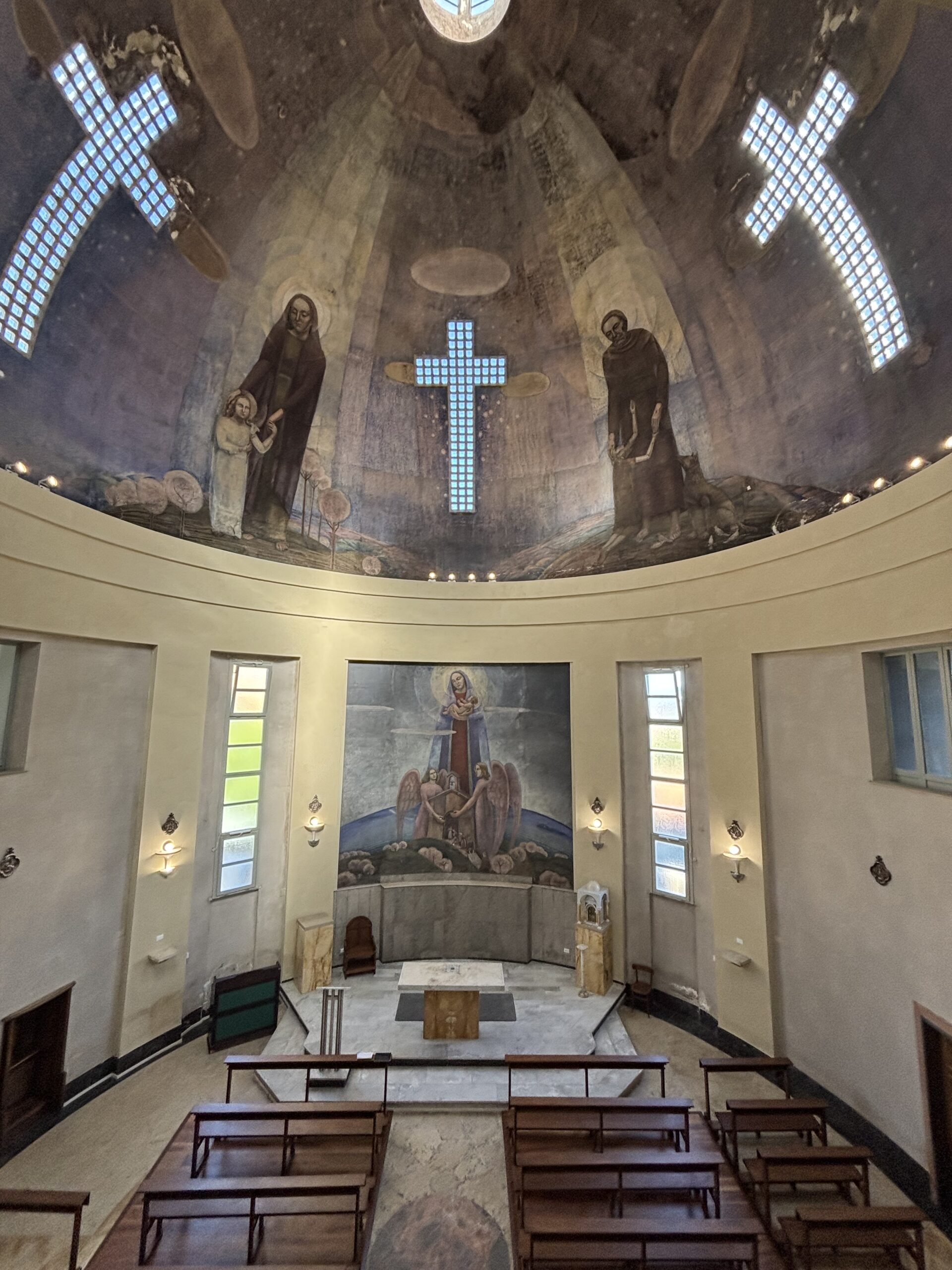 Il progetto per la costruzione della cappella a pianta centrale, realizzata tra il 1936 e il 1943, fu affidato per concorso pubblico all’ingegner Carlo Cucchia nell’ambito dell’ampliamento dell’allora ospedale di Monteluce. La cappella ospita un ciclo pittorico realizzato da Gerardo Dottori che, pur mantenendo un linguaggio tradizionale adatto a un luogo di preghiera, integra elementi tipici dell’aeropittura futurista, con scenari lirici e visioni dall’alto del paesaggio umbro.