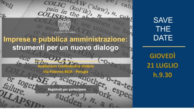 Sarà dedicato ai rapporti con la Pubblica amministrazione il seminario organizzato da Confindustria Umbria in programma giovedì 21 luglio alle ore 9.30 a Perugia nella sede dell'Associazione.